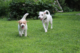 Nemo ja Nuga kirmasivat myös talon parsonnarttujen Kristan ja Riemun (Lunan pentu) kanssa. Pojat tiesivät heti paikkansa, Krista on joukon pomo. Sen sijaan Nugasta oli hienoa, kun Riemu (Nugan sisarpuoli) heittäytyi vähän väliä selälleen ja kerrankin Nuga ei ollut ihan kastin alimmaisena. Kiltisti kyllä leikkivät ja juoksentelivat pitkin poikin. Nemon piti jotain Riemulle rähistä, mikä ärsyttää mua, kun muuten niin hyvin kaikkien kanssa tulee juttuun, mutta pennut on jotenkin ottanut Nemoa hermoon sen jälkeen, kun niitä omassa kodissa pyöri (Ansku ja Nuga ;).
