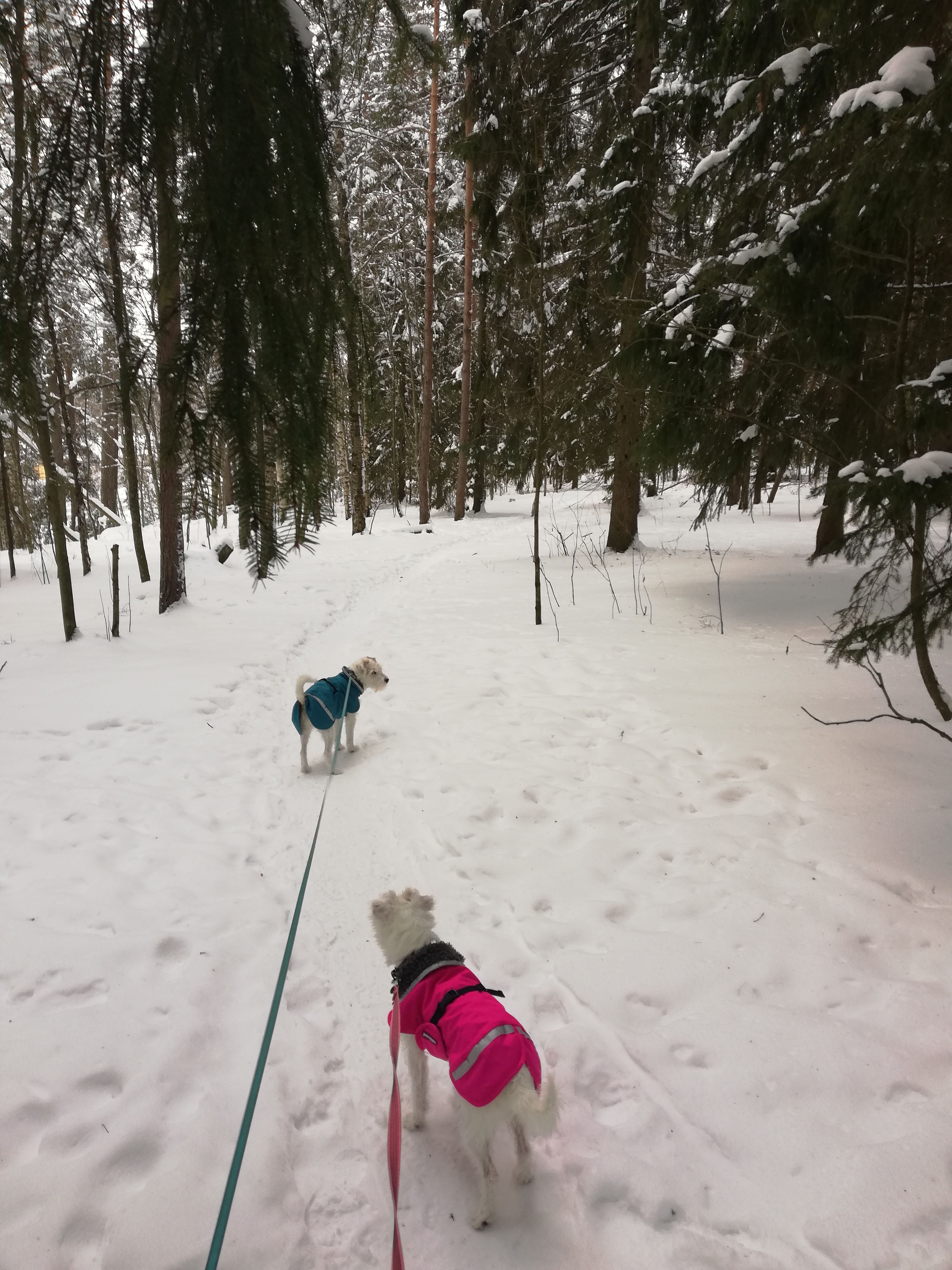 Pakkanen paukkuu! En muista aikuisiällä, että olisi koskaan Tampereella ollut tällaista paukkupakkasputkea, onko tämä nyt neljäs vai viides viikko peräkkäin. Joka lenkillä on kylmä, joten ei paljon eroa, onko -6 (ja hyytävä viima) vai -18 (tyyntä). Ollaan siis lenkkeilty normaaliin tapaan joka päivä koirien kanssa. Tassuja välillä paleltaa, jos joutuu odottamaan toista paikallaan, mutta aika harvakseltaan, joten ei olla tossuja alettu näpräämään jalkoihin... Takit jo aiheuttaa apeaa tunnelmaa eteisessä :D